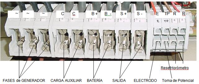 Las fases del generador no tienen polaridad, al igual que la resistencia de carga auxiliar. Se debe prestar atención al conexionado del banco de batería y la salida pues sí tienen polaridad indicada.