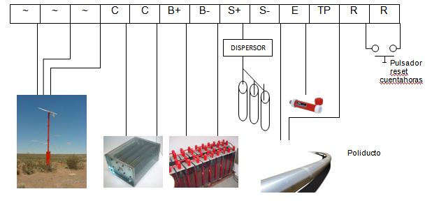 4- Conectar la salida, cuidando la polaridad: S+ al dispersor , S- a la tubería, con sección no inferior a 10mm2.